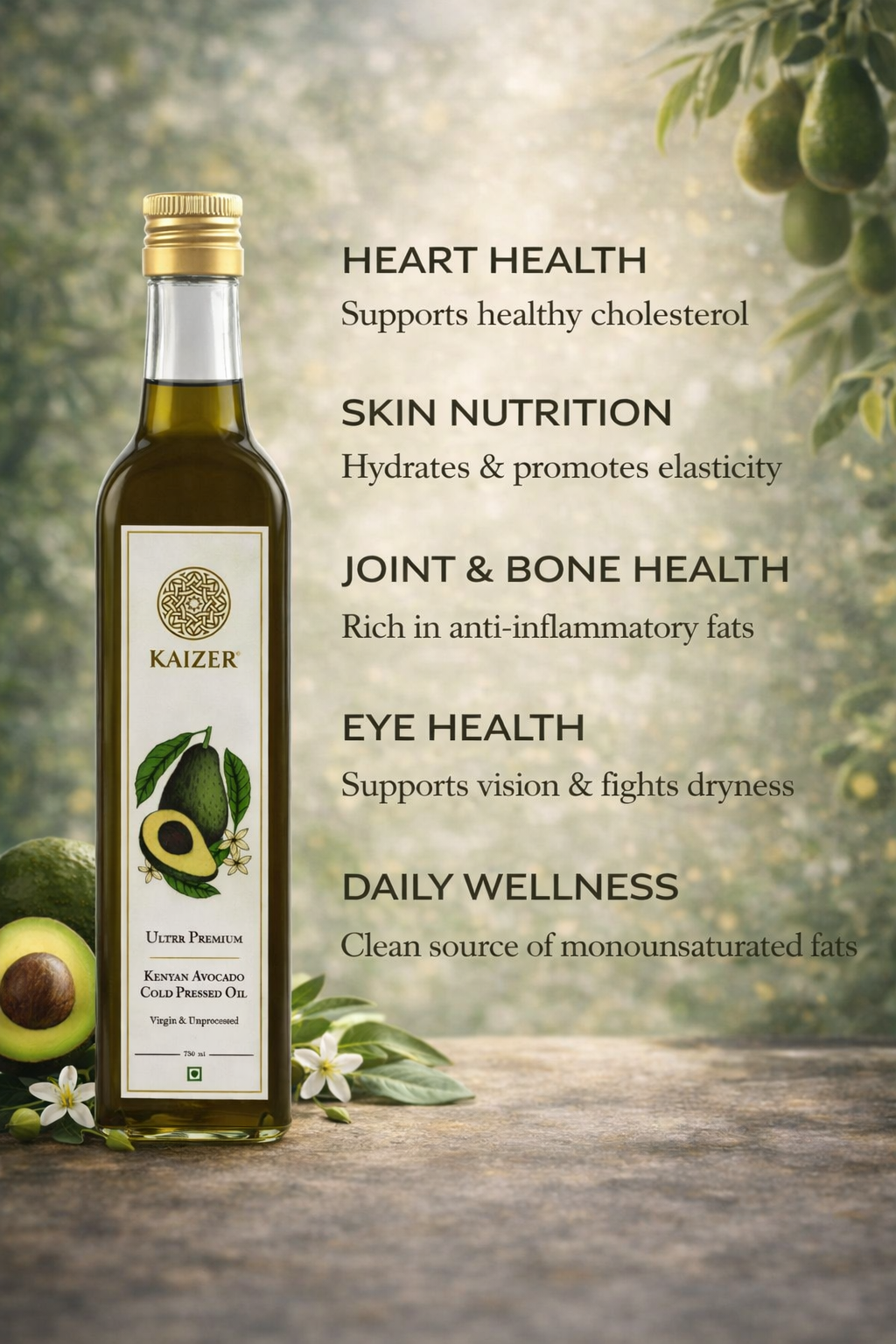 Pure, potent, and versatile, Kaizer brings you the best avocado oil—a true luxury for health, skin, hair, and cuisine.