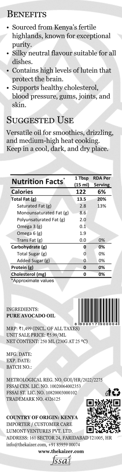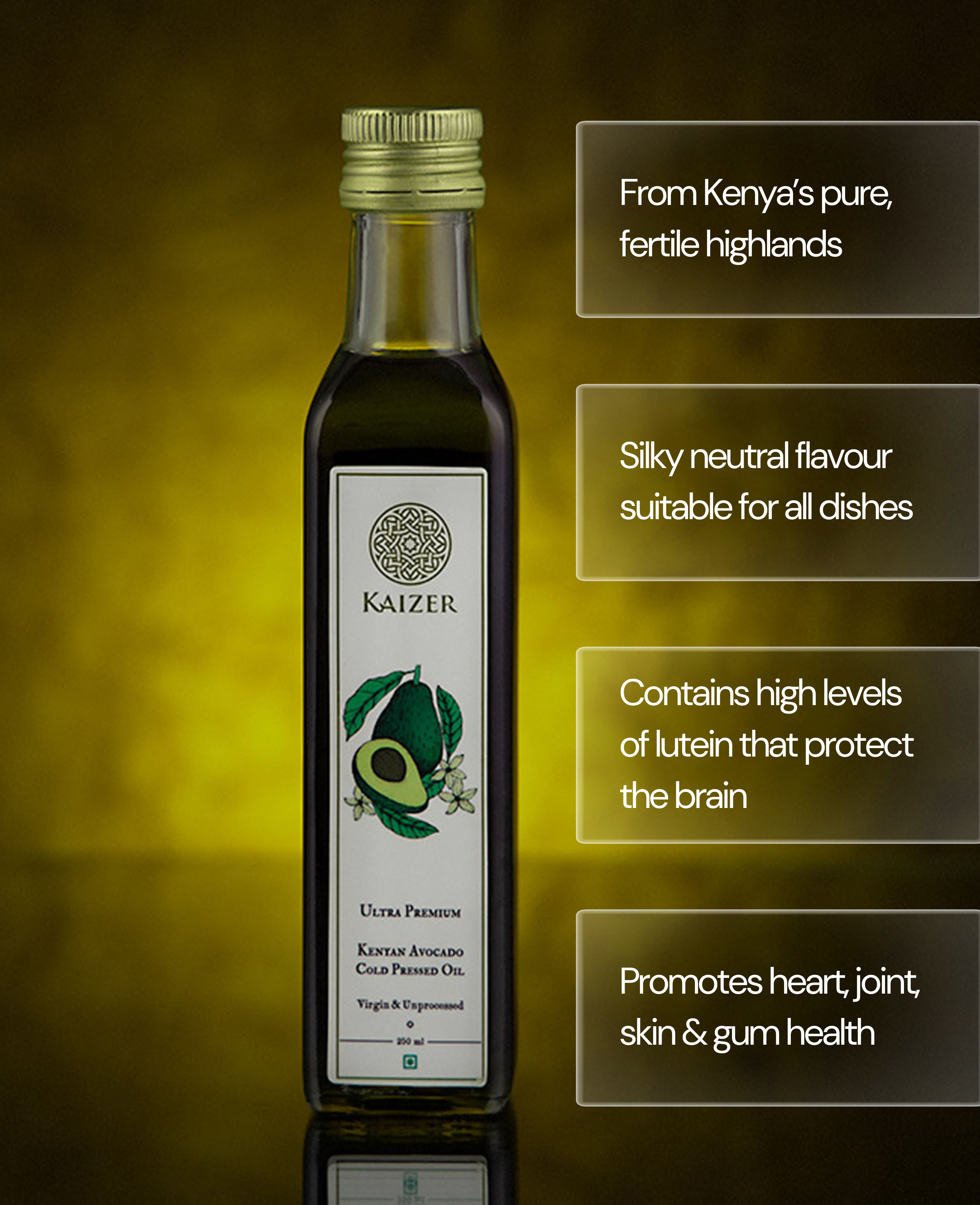 Pure, potent, and versatile, Kaizer brings you the best avocado oil—a true luxury for health, skin, hair, and cuisine.