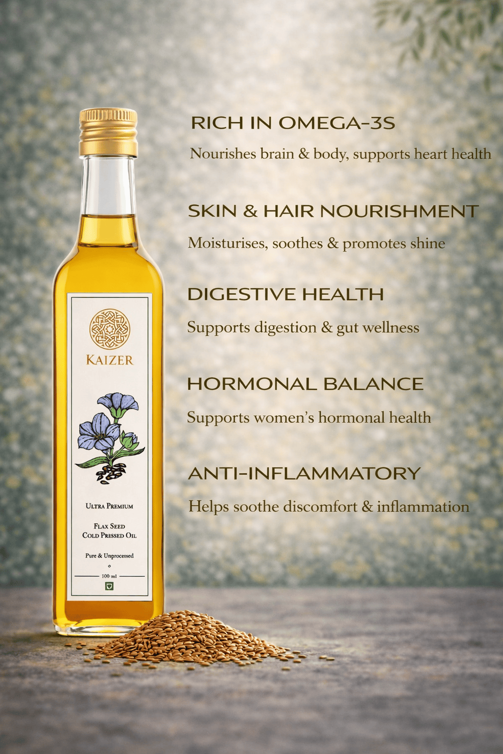 Whether for cooking, daily nutrition, or natural care, Kaizer’s cold-pressed flaxseed oil brings you the purest expression of flax oil benefits—luxury and health in every drop.