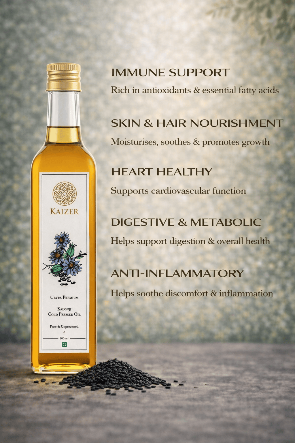 Embrace the timeless tradition of wellness with Kaizer Cold-Pressed Kalonji Oil, also known as black seed oil. Extracted from the finest kalonji seeds, this powerful oil has been treasured for centuries for its wide-ranging health and beauty benefits.
