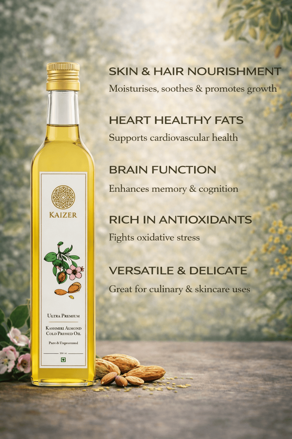 Discover the purity of Kaizer Cold-Pressed Almond Oil, also known as badam oil. Packed with vitamin E, antioxidants, and healthy fats, this naturally sweet oil is treasured for its wide-ranging almond oil benefits—from everyday cooking to skincare and haircare.