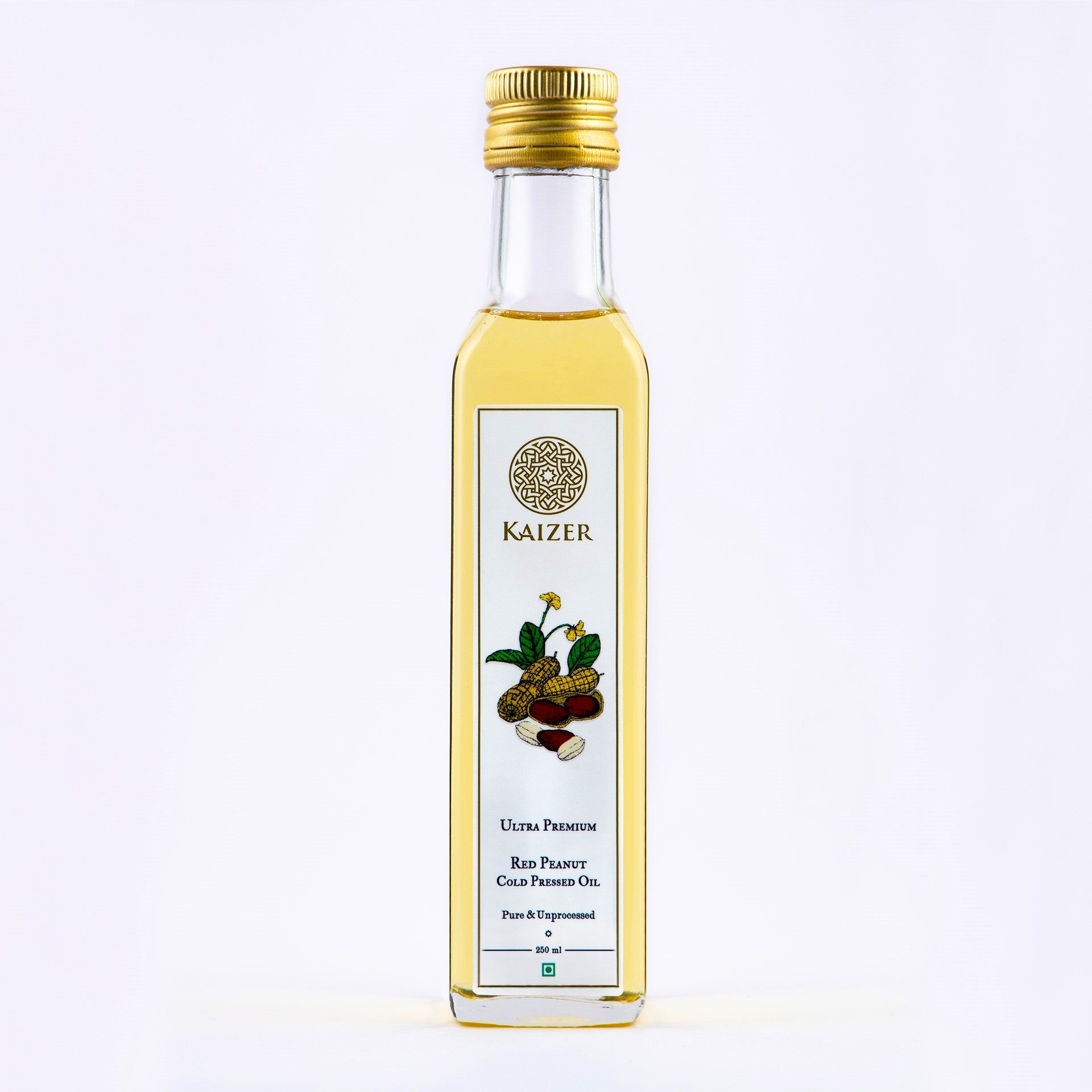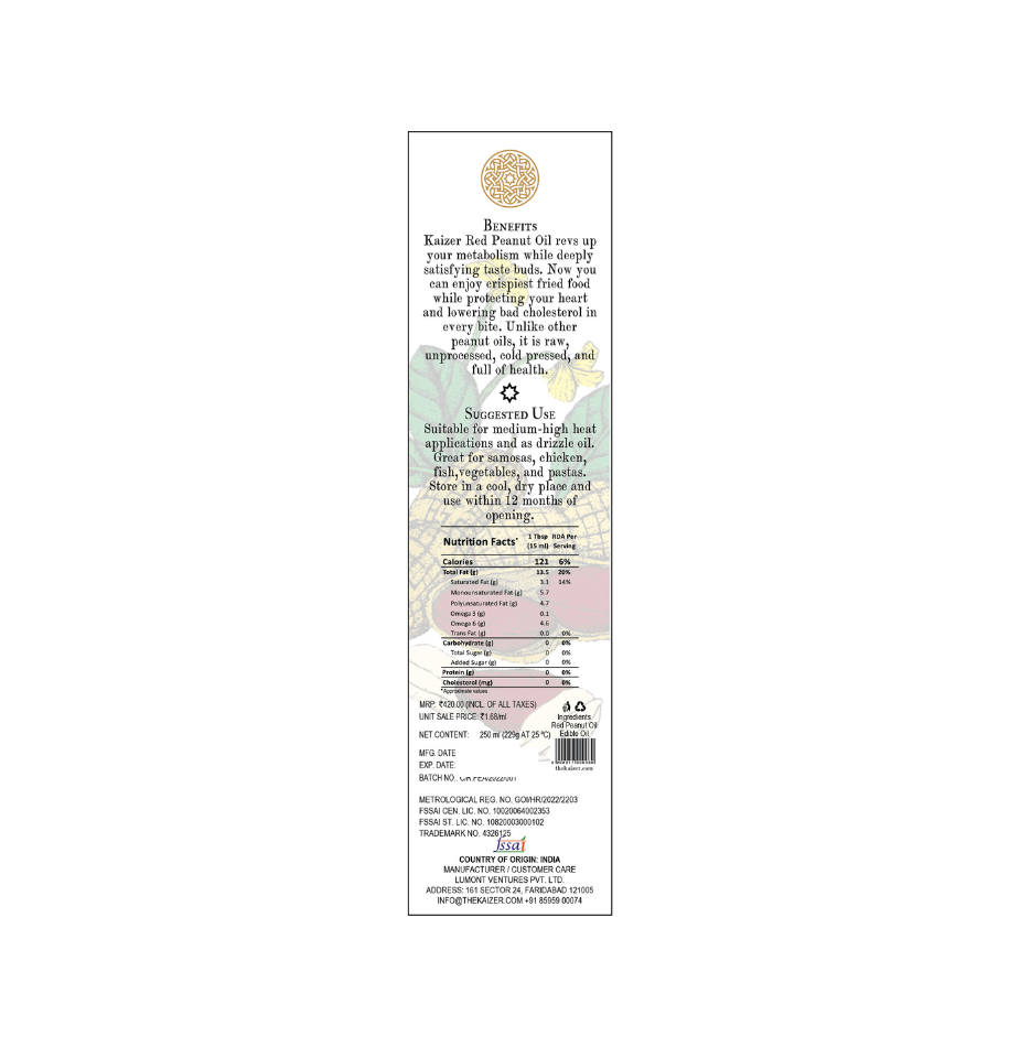 Savour the purity of Kaizer Cold-Pressed Peanut Oil, also known as groundnut oil. Extracted gently with red skin to preserve its natural nutrients, this golden oil is valued for both its taste and its health-enhancing qualities.