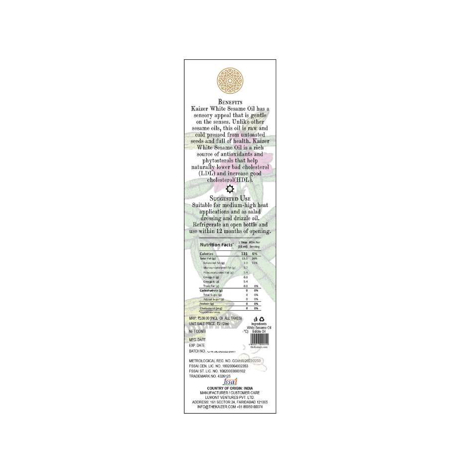 Discover the timeless tradition of Kaizer Cold-Pressed Sesame Oil, crafted from the finest white sesame seeds and rich in nutrients that have been treasured for centuries. With its delicate aroma and golden hue, it is one of the most versatile oils for both wellness and cuisine.